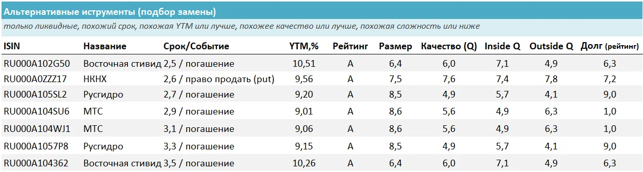 - Аналог с приближенной доходностью ВосточнаяСК (ISIN: RU000A102G50; YTM 10,5%), обладает немного худшими показателями качества и долга (см. в таблице выше).