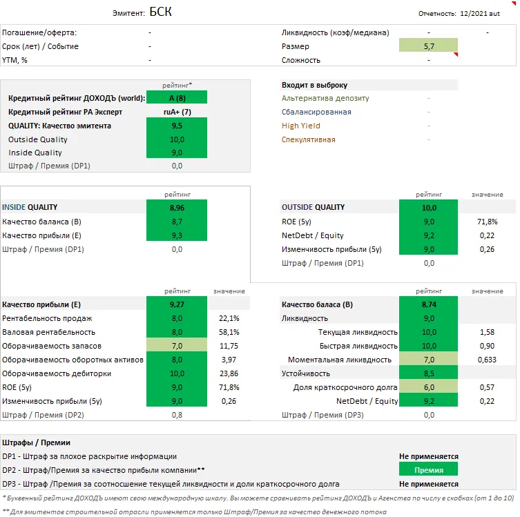 Общее качество эмитента - "Высокое" (9.5/10) – Общая бизнес модель компании стабильна. Отличная комбинация эффективности и долговой нагрузки. Проблемы с диверсификацией активов.