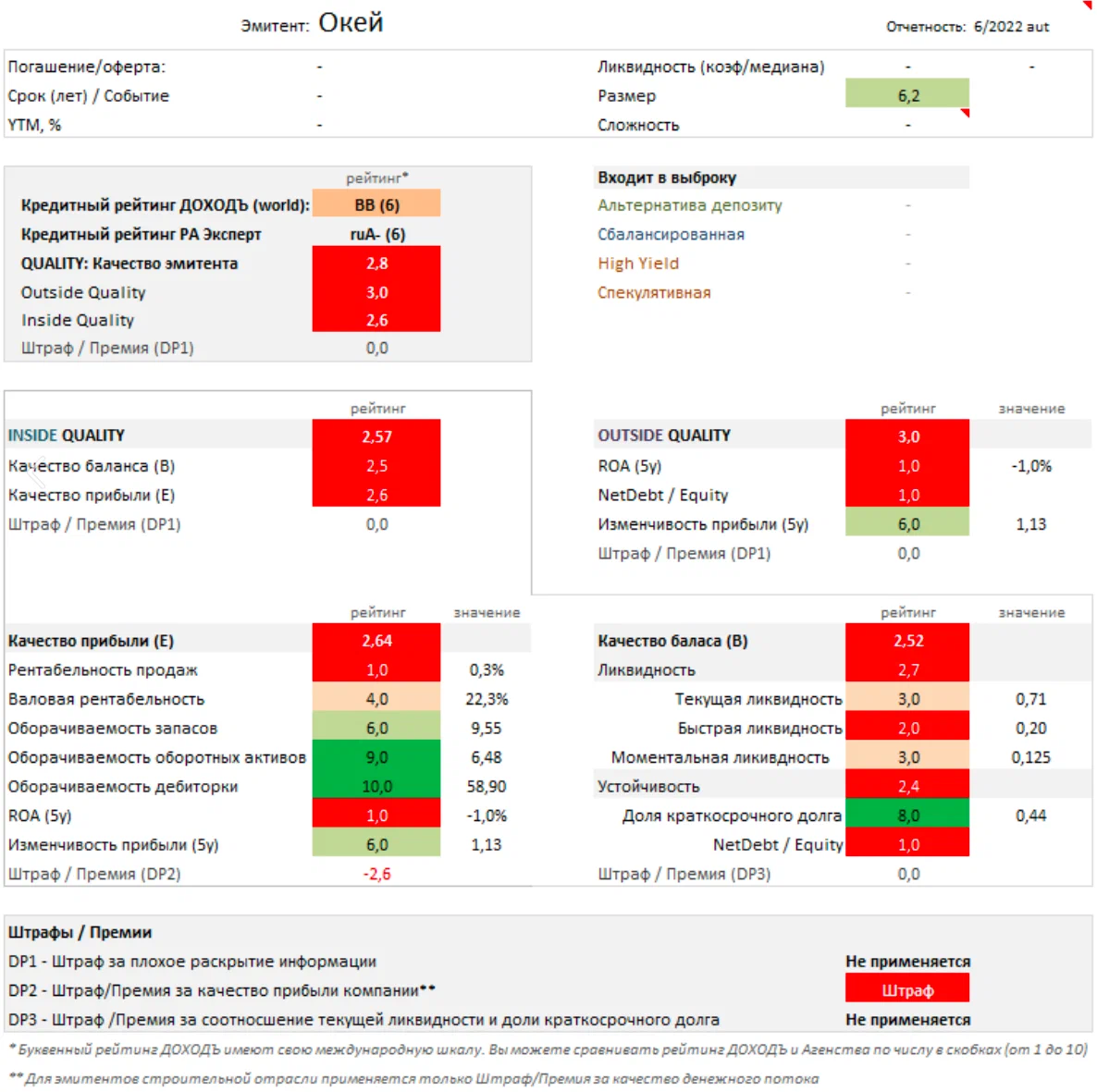 Общая оценка качества бизнеса (Outside Quality) – «Низкая» (3/10) - Эмитент имеет высокую долговую нагрузку NetDebt/Equity (рейтинг 1.0 из 10), которая не компенсируется низкой эффективность ROA (1.0 из 10).