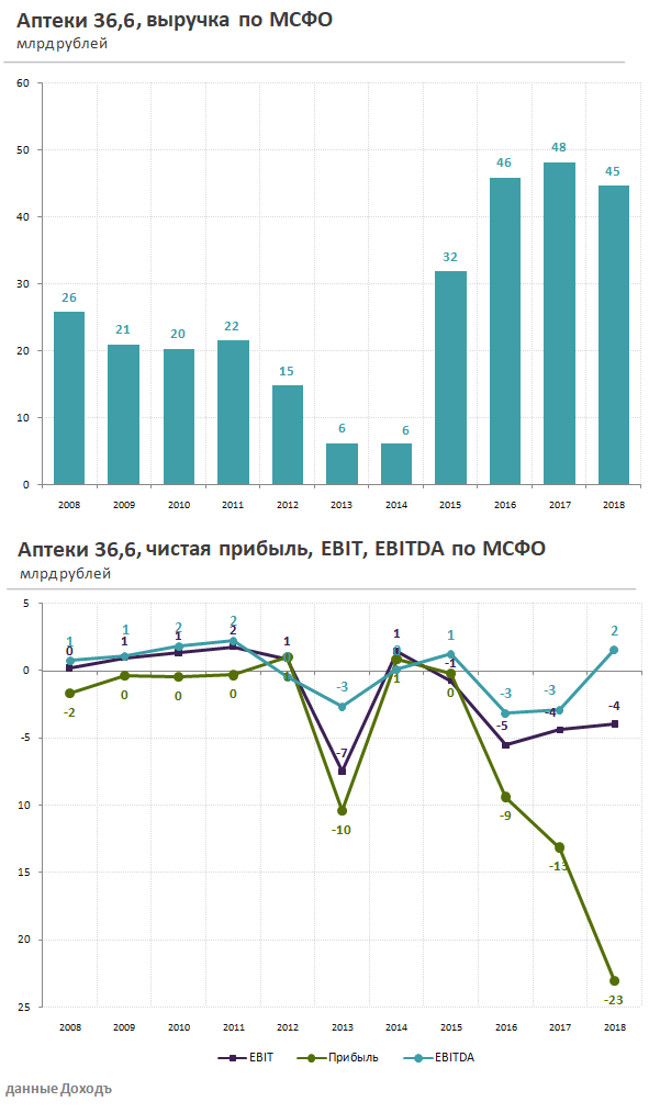 «Аптеки 36,6» являются одним из лидеров российского рынка торговли лекарствами. Торговый оборот компании по итогам 2018 года составил 45 млрд рублей, что стало четвертым результатом среди российских аптечных сетей. При этом компания находится в тяжелом финансовом положении. Операционный убыток «36,6» по итогам 2018 года составил около 4 млрд рублей, практически не изменившись по сравнению с предыдущим годом. Чистый убыток за период достиг 23 млрд рублей, то есть составил половину от выручки компании. На результат повлияли процентные расходы в 6 млрд рублей и списания нематериальных активов на сумму около 10 млрд рублей. Компания получает убыток на протяжении четырех лет, при этом с каждым годом он увеличивается.