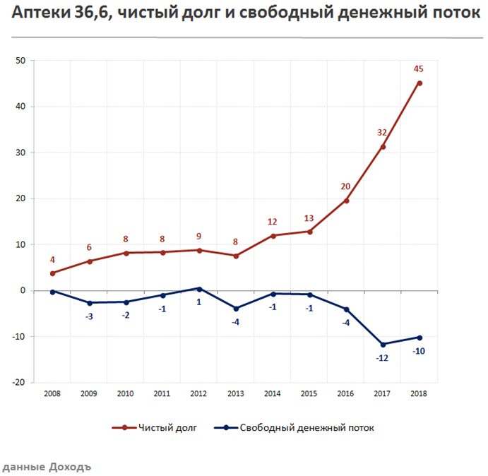 Чтобы продолжать функционирование, «Аптекам» приходится увеличивать долговую нагрузку. По итогам 2018 года чистый долг компании увеличился в 1,5 раза достигнув 45 млрд рублей. С размером долга на уровне более 30 EBITDA и процентными платежами, в несколько раз превышающими операционный денежный поток, компания фактически находится на грани банкротства.