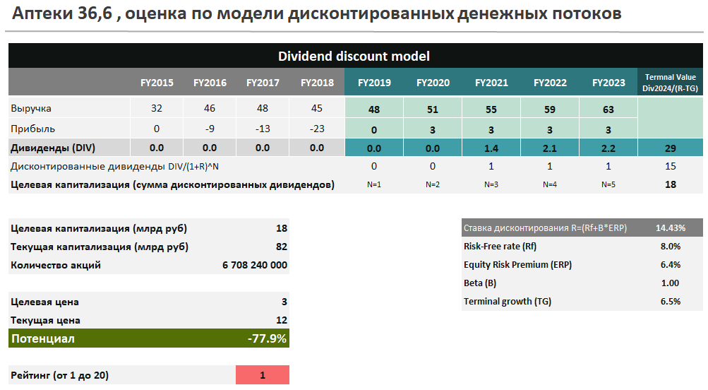 В нашей финансовой модели мы формируем оптимистичный прогноз по финансовым показателям компании: рост выручки на 7% в год, потенциальное достижение маржи чистой прибыли в 5% и долгосрочная выплата дивидендов в 60% от прибыли после 2023 года. Даже в таком сценарии оценка дает один из самых низких потенциалов роста акций компании на российском рынке.