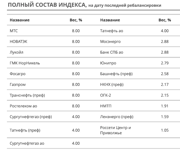 Полная структура представлена на картинке ниже, а подробные данные и параметры индекса и фонда можно на найти здесь: