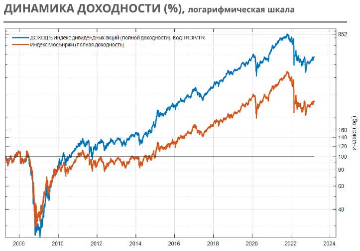 Динамика полной доходности (включая дивиденды) индекса IRDIVTR и Индекса МосБиржи Полной доходности.