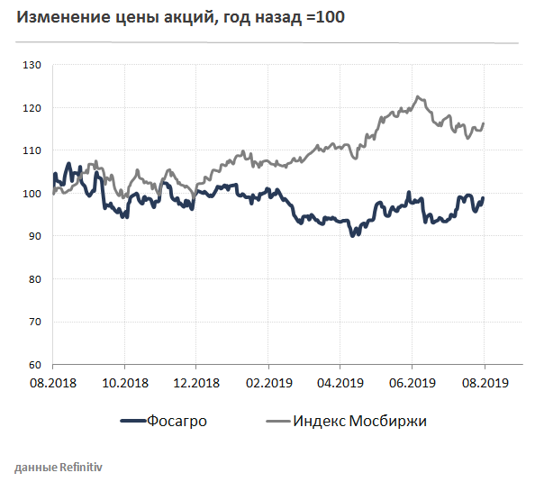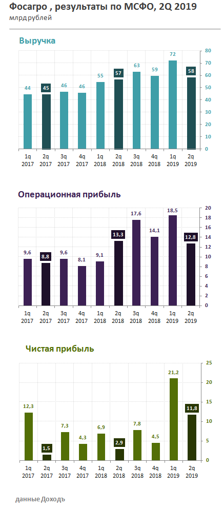 Выручка Фосагро во 2 квартале увеличилась на 3% г/г до 58,1 млрд рублей благодаря снижению курса рубля в годовом выражении, которое компенсировало падение цен на удобрения. Объем продаж апатитового концентрата и удобрений за год практически не изменился, составив 3 млн тонн. Менеджмент компании подтвердил прогноз по росту производства в 2019 году на 6%. Компания ставит цель увеличивать производство удобрений в натуральном выражении на 5-10% ежегодно.