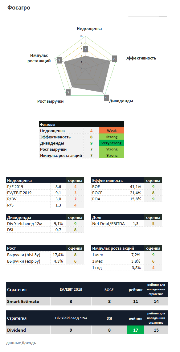 По стоимостным мультипликаторам Фосагро оценивается дороже среднерыночного уровня (P/E 2019 = 8,6; EV/EBIT 2019 = 9,1). Несмотря на высокий показатель рентабельности инвестированного капитала, акции не проходят в портфель по стратегии, рассчитанной на поиск недооцененных и эффективных компаний (Smart Estimate).