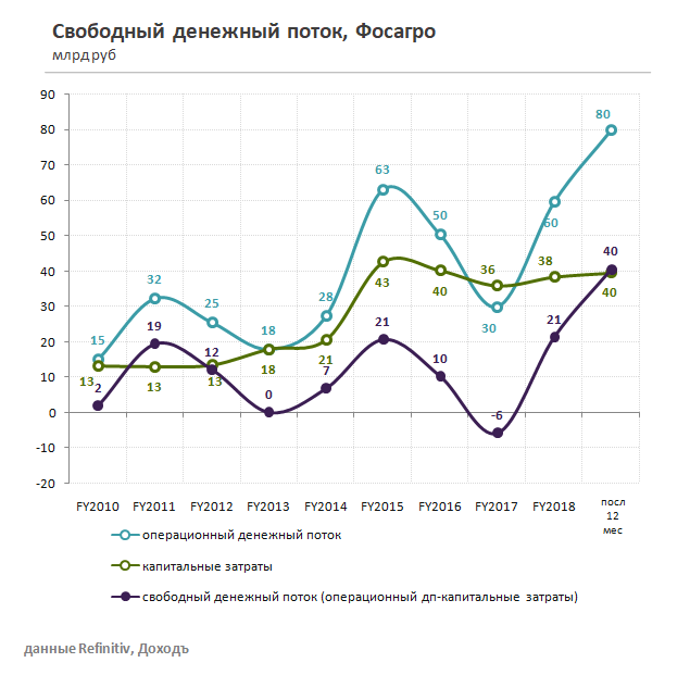 Рост объемов продаж и снижение курса рубля позволяют Фосагро показывать рекордный свободный денежный поток, несмотря на стагнацию цен на рынке удобрений. За последние 12 месяцев показатель достиг 40 млрд рублей или около 12% от капитализации компании. Фосагро не планирует увеличивать инвестиции в ближайшие годы, что позволяет использовать денежные средства для погашения долга и увеличения дивидендов.