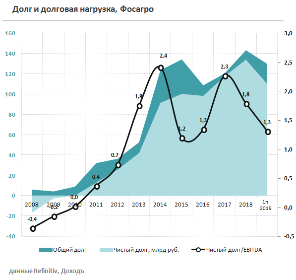 Долговая нагрузка Фосагро находится на среднерыночном уровне: коэффициент Чистый долг/EBITDA за год снизился с 2,1x до 1,3x в основном благодаря росту EBITDA.