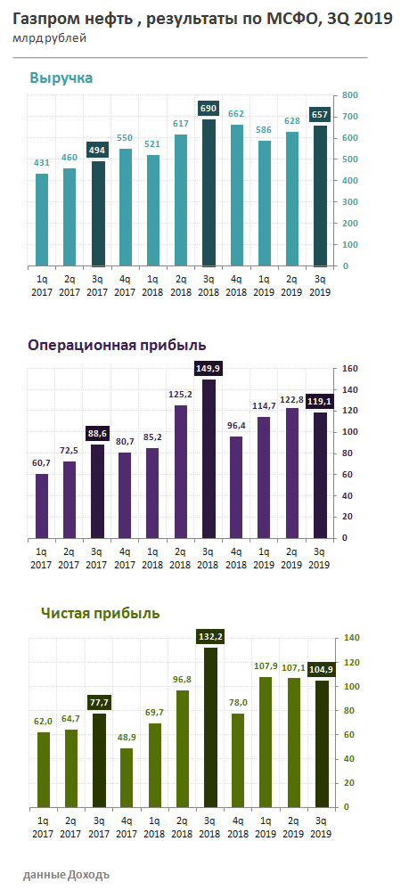 Газпром нефть, четвертая по добыче нефти компании России, снизила выручку по итогам 3 квартала 2019 года на 4,8% в годовом выражении до 656,8 млрд рублей. Операционные расходы росли более высокими темпами, поэтому операционная и чистая прибыль компании сократилась на 20,6% в годовом выражении. Результат оказался ожидаемо негативным из-за снижения цены нефть в рублях. Год назад баррель Brent в рублевом эквиваленте стоил на 26% дороже.