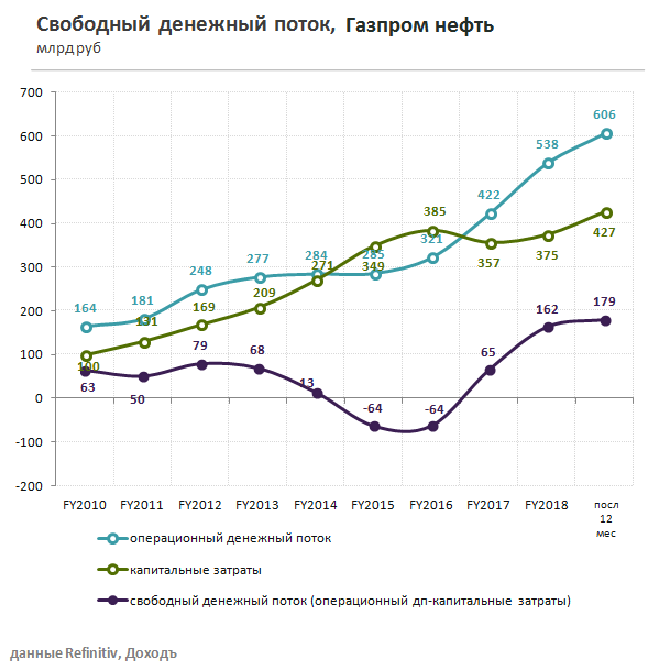 С учетом значительного свободного денежного потока и отсутствия необходимости увеличивать инвестиции, менеджмент, скорее всего, примет решение об увеличении коэффициента выплат до 50% от прибыли по МСФО уже по итогам 2019 года. Заместитель гендиректора по экономике и финансам компании Алексей Янкевич на телефонной конференции для инвесторов подтвердил, что дивиденды Газпром нефти за 2019 год могут превысить 200 млрд рублей, что косвенно подтверждает намерение рекомендовать выплаты на уровне 50% прибыли.