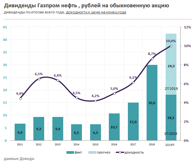 Согласно дивидендной политике, Газпром нефть направляет на дивиденды не менее 15% чистой прибыли по МСФО или 25% прибыли по РСБУ. Выплаты осуществляются два раза в год.