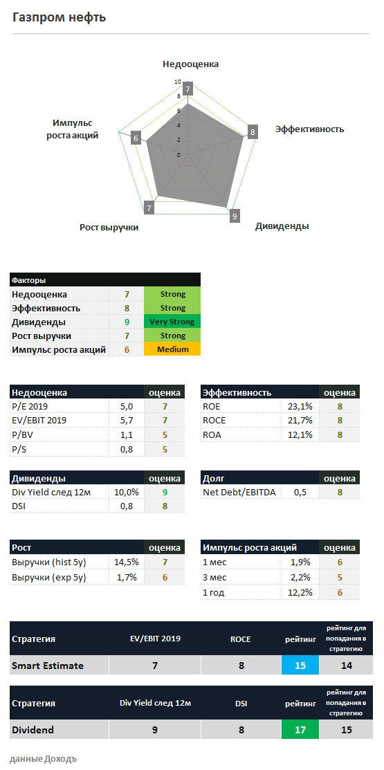 По стоимостным мультипликаторам Газпром нефть немного недооценена относительно рынка (P/E 2019 = 5,0; EV/EBIT 2019 = 5,7), имеет хорошие показатели рентабельности. Совокупного рейтинга достаточно для сохранения места в стратегии Smart Estimate.