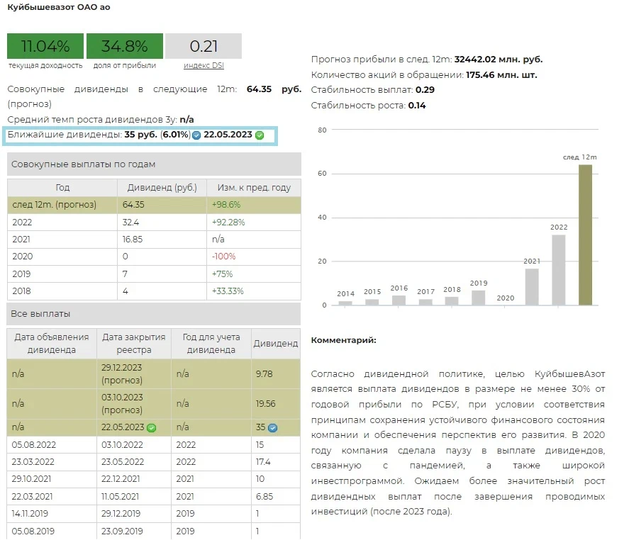 ​​Совет директоров КуйбышевАзот рекомендовал выплату итоговых дивидендов за 2022 год в размере 35 рублей на обыкновенную и привилегированную акции. Дата закрытия реестра 22 мая 2023 г.