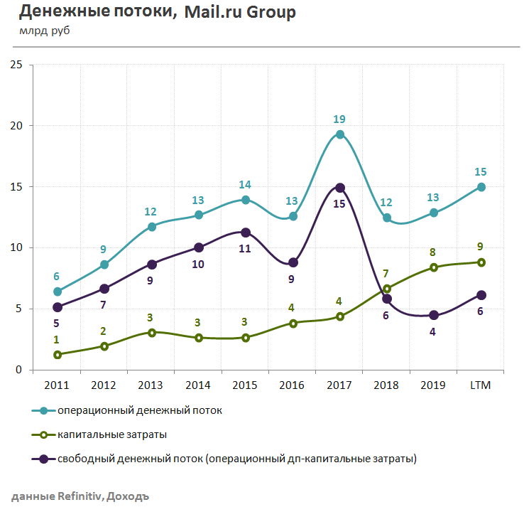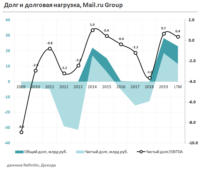 Кроме того Mail.ru в прошлом году увеличила долг до 23,5 млрд рублей под создание СП с Alibaba, Мегафон и РФПИ – «AliExpress Russia» (доля владения 15%) и СП со Сбербанком – «O2O» -сервиса в сфере транспорта и еды (доли владения будут равными со Сбербанком). Текущая долговая нагрузка на уровне 0,4х.