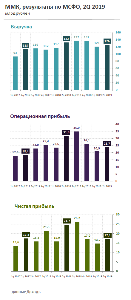 Снижение цен на сталь привело к сокращению выручки ММК во втором квартале 2019 года на 4,5% в годовом выражении до 126,1 млрд руб. Расходы росли более быстрыми темпами, в основном по причине резкого роста стоимости железорудного сырья (+65% с начала года), что привело к падению операционной прибыли на 25,4% до 23,7 млрд руб. Чистая прибыль снизилась на 30,7% до 17,1 млрд руб. Результаты оказались слабее, чем у других крупных российских производителей стали – Северстали  и НЛМК.