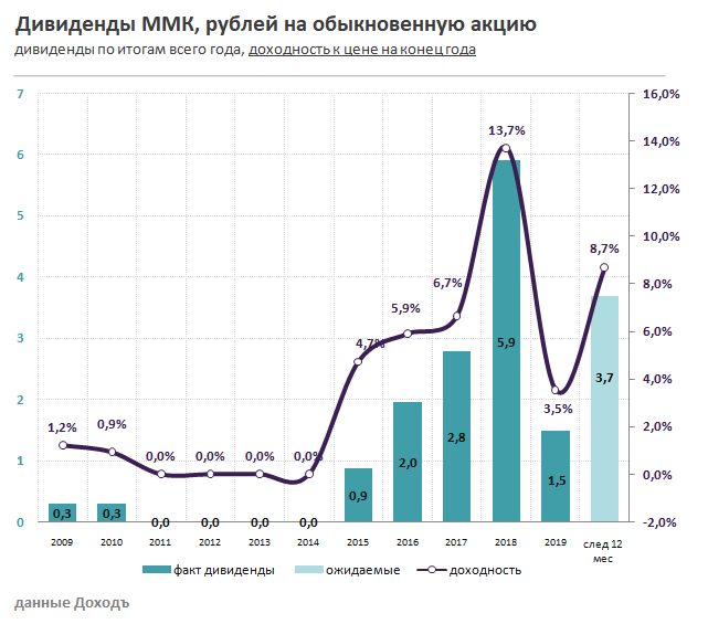 Ожидаемая дивидендная доходность акций ММК в ближайшие 12 месяцев составляет 8,7%. Несмотря на падение размера дивидендов, текущая доходность и индекс стабильности выплат позволяет сохранять акции ММК в портфеле по дивидендной стратегии.