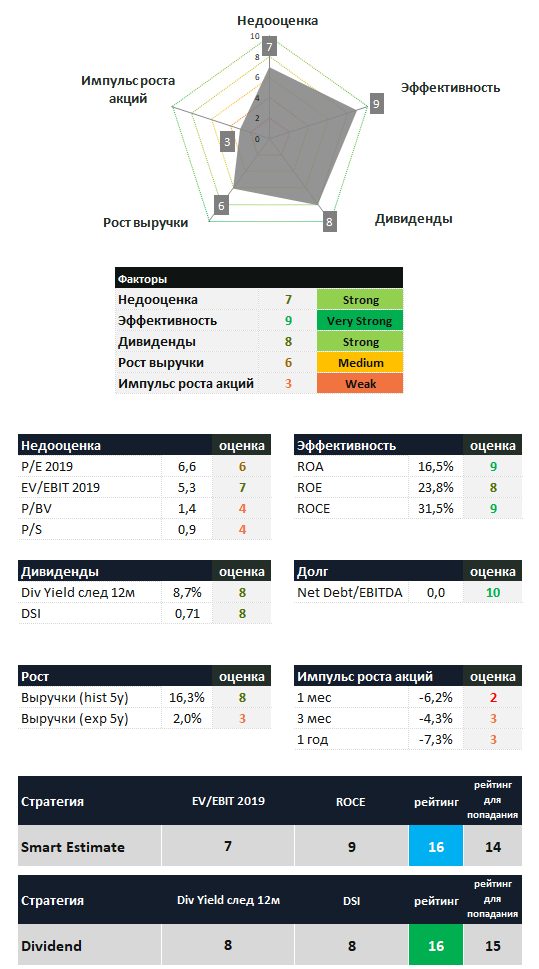 Несмотря на ухудшение мультипликаторов, ММК с учетом долга стоит дешевле рынка (EV/EBIT 2019 = 4,7). С учетом высокой рентабельности это позволяет акциям компании проходить в портфель поиска эффективных недооцененных компаний Smart Estimate.