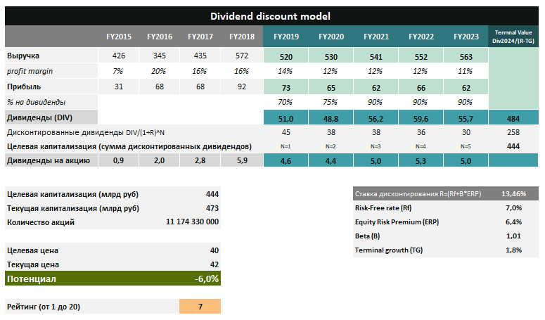 DCF-модель отражает наши ожидания стагнации цен на металлы и низких темпов роста выручки ММК. Маржа чистой прибыли компании при этом сократится к историческим средним. Модель предполагает, что дивиденды в ближайшие годы расти не будут, что ведет к низкому потенциалу роста стоимости акций. Рейтинг по DCF-модели составляет 7 из 20. Это соответствует рекомендации держать долю акций ММК в портфеле ниже, чем подразумевает бенчмарк.