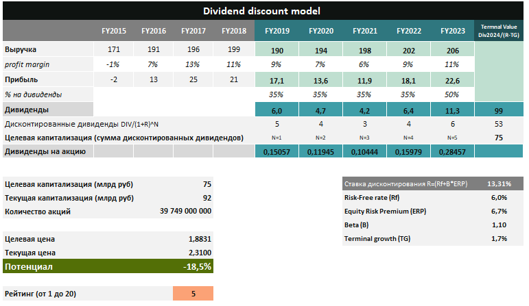 Дивидендная политика компании позволяет направлять на дивиденды акционерам от 5% до 35% чистой прибыли по РСБУ. По итогам 2018г на выплаты направили 35% прибыли. Сохранение коэффициента выплат на прежнем уровне позволит акционерам рассчитывать на дивиденд в размере около 0,15 рублей на акцию. Ожидаемая дивидендная доходность по итогам 2019 года составляет 6,4%. Этого недостаточно для попадания в портфель по дивидендной стратегии
