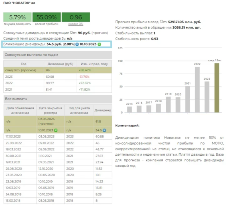 Совет директоров Новатэка рекомендовал выплату дивидендов за 1 полугодие 2023 года в размере 34,5 руб. на одну акцию. Дата закрытия реестра 10 октября 2023 года.