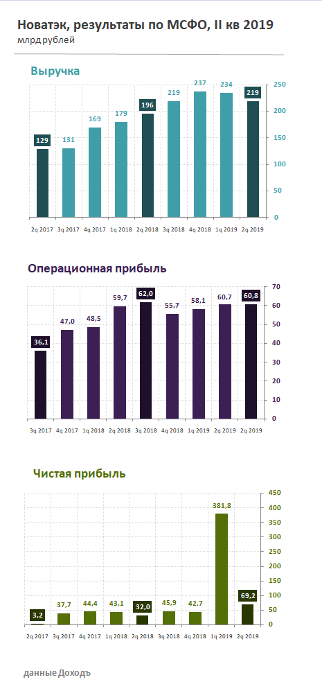 Скачок прибыли в первом квартале 2019 года был вызван продажей 10% в проекте «Арктик СПГ 2» французской Total, что принесло Новатэку 308,6 млрд руб. В июне было объявлено о продаже еще 30% проекта консорциуму японских компаний Mitsui и Jogmec, а также китайским компаниям CNODC («дочка» CNPC) и CNOOC. Результаты продажи найдут отражение в финансовых показателях Новатэка во второй половине 2019 года. Полученные средства, скорее всего, в виде кредитов будут предосталены «Арктик СПГ 2» для финансирования его реализации.