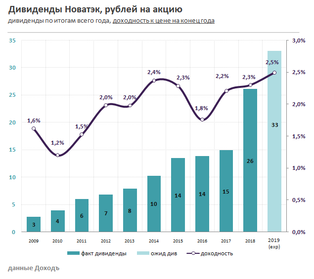 Согласно дивидендной политике, Новатэк выплачивает не менее 30% от нормализованной чистой прибыли, где не учитываются доходы от продажи долей в проектах и влияние курсовых разниц. В 2018 году коэффициент выплат составил 38%. По итогам 2019 года мы ожидаем дивиденды Новатэка в размере 99 млрд рублей или 33 рубля на акцию. Доходность к текущим ценам составляет 2,5%. Несмотря на идеальный коэффициент стабильности и роста выплат акционерам, из-за низкой дивидендной доходности компания не попадает в портфель по дивидендной стратегии.