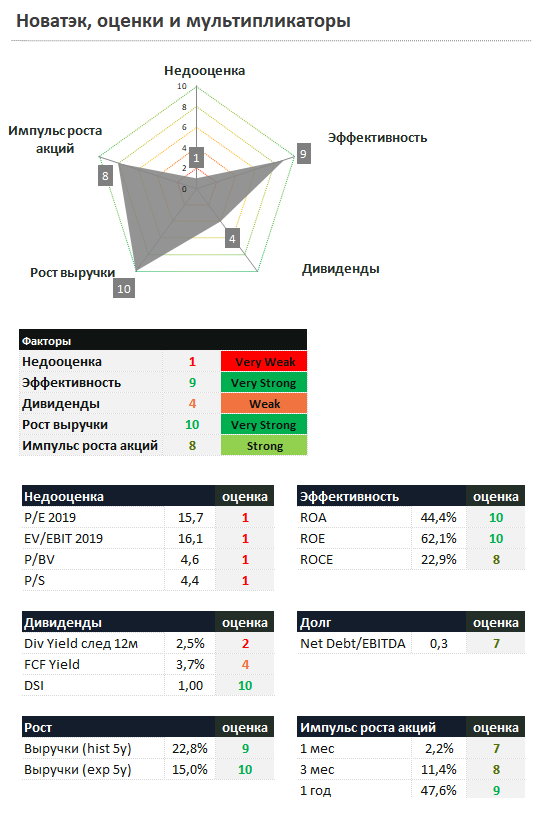 Новатэк – классическая компания роста с перспективами наращивания выручки значительно лучше рынка, высокой эффективностью и сильным импульсом роста акций. В тоже время, мультипликаторы компании являются одними из самых высоких на российском рынке (P/E 2019=15,7, без учета разовых доходов и курсовых разниц; EV/EBIT 2019=16,1), что не позволяет акциям Новатэка попасть в стратегии, рассчитанные на поиск недооцененных компаний. Новатэк не проходит в портфели по дивидендной стратегии и стратегии Smart Estimate.