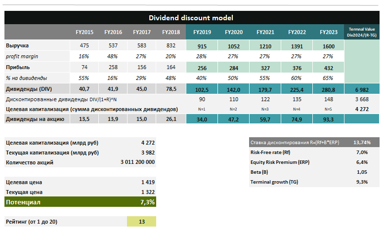 Наша модель дисконтирования будущих дивидендов Новатэка предполагает долгосрочный рост выручки компании средним темпом на 10% в год, сохранение высокого показателя маржи чистой прибыли и рост коэффициента дивидендных выплат до 65% от прибыли. Целевая цена в модели на 7% выше текущего значения, что близко к среднему уровню для компаний в «Анализе акций». Рейтинг Новатэка по DCF-модели составляет 13 из 20, что соответствует рекомендации «держать» долю акций компании на уровне бенчмарка.
