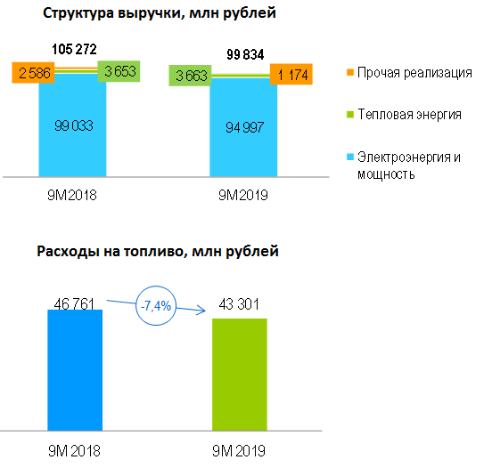 По итогам 9 месяцев 2019 года выручка ОГК-2 снизилась на 5,2% г/г до 99,8 млрд рублей. Уменьшение закупок топлива по причине снижения выработки электроэнергии привело к сокращению расходов и росту операционной прибыли на 38% г/г до 17,5 млрд рублей. Чистая прибыль выросла на 60% до 12,2 млрд рублей.