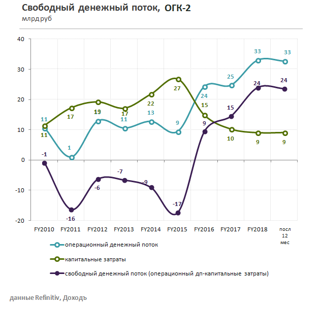 Повышенные платежи по договорам по поставке мощности и сокращение инвестиций позволяют ОГК-2 генерировать значительный свободный денежный поток, доходность которого на акцию составляет 32,5%. Рост показателя позволяет сокращать долг и перейти к потенциальному увеличению дивидендов.