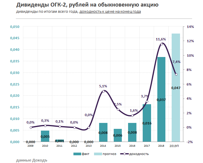 По итогам 2018 года менеджмент «Газпром энергохолдинга», ключевого акционера ОГК-2, увеличил выплаты с 25% до 35% прибыли. Мы полагаем, что при текущих перспективах роста прибыли ОГК-2, существует высокая вероятность увеличения коэффициента выплат до 50%. Пока мы оставляем консервативный прогноз в 35%.