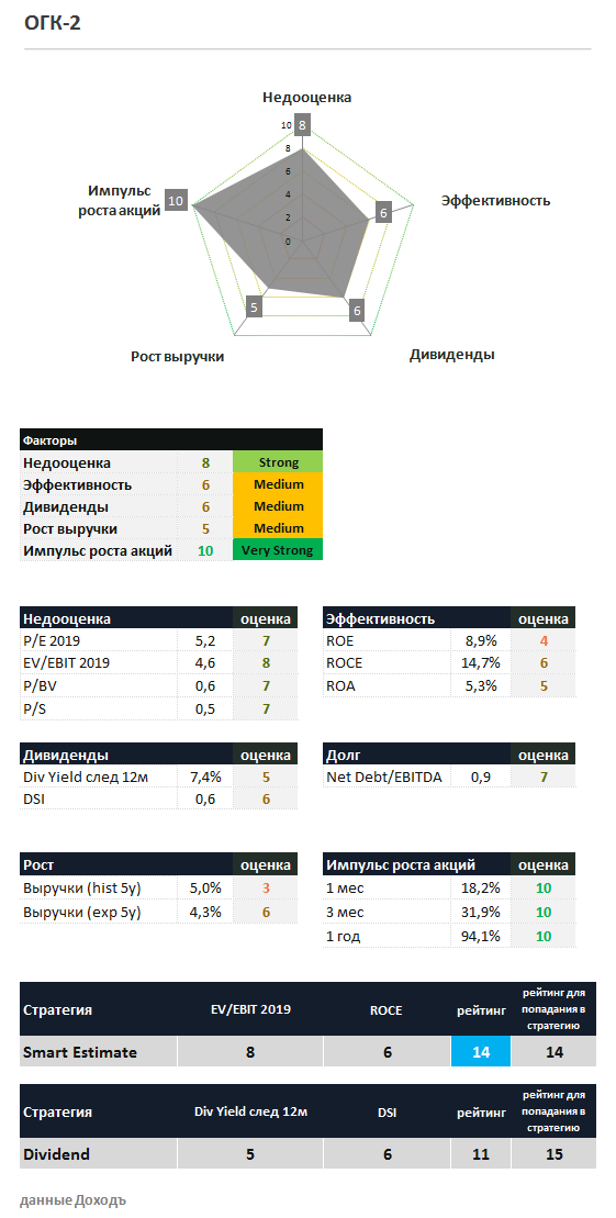 С учетом долга компания дешево оценивается рынком (EV/EBIT 2019=4,6). Положительная динамика операционных результатов и рентабельность инвестированного капитала на уровне рынка позволяют нам сделать акции ОГК-2 кандидатом на попадание в портфель недооцененных и эффективных компаний Smart Estimate.