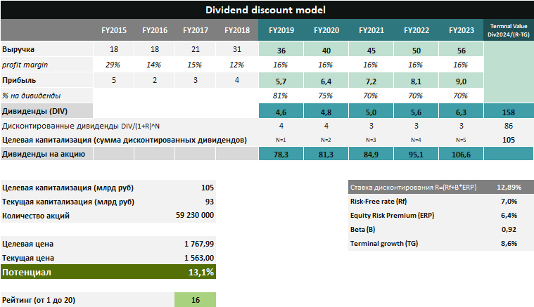 В модели дисконтирования дивидендов мы предполагаем, что рост выручки по итогам 2019 года может составить 17%, при этом в ближайшие 4 года темп роста замедлится до 12%. По сравнению с обзором по итогам 1 квартала 2019 года мы повысили ожидаемые показатели маржи чистой прибыли, что привело к росту целевой цены на 17%. Тем не менее, из-за роста акций QIWI в последние месяцы рейтинг по DCF-модели сократился с 20 до 16. Показатель соответствует рекомендации  «Buy» - держать долю акций выше доли в бенчмарке.