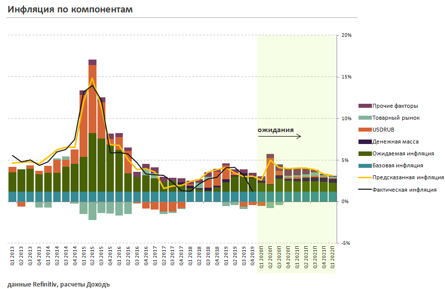 Целевое значение показателя инфляции установлено Банком России на уровне 4%. Ожидаемая долгосрочная инфляция ниже таргета позволяет регулятору снижать ставку. Риски роста инфляции выше таргета приводят к решению о росте ставки.