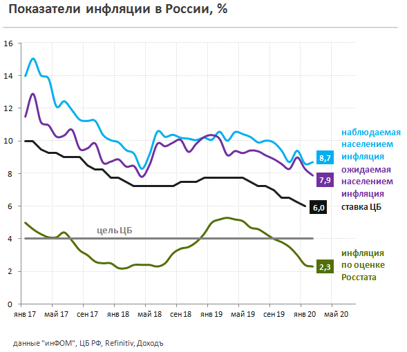 С октября прошлого года ежемесячный темп роста цен сохраняется на уровне ниже таргета. По последним данным на февраль 2020 года Росстат зафиксировал показатель на уровне 2,3% г/г - минимум с июня 2018 года. Наблюдаемая инфляция при этом растет, а учитывая фактор курса рубля и влияние возможного ажиотажного спроса на потребительские товары – продолжит расти вместе с другими показателями инфляционных ожиданий.