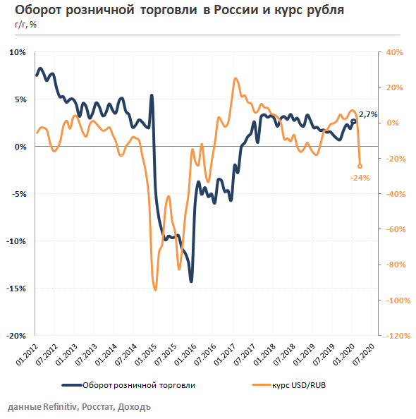Изменения курса рубля оказывает отложенный эффект на динамику внутреннего спроса. В январе темпы роста оборота розничной торговли увеличились до рекордных с декабря 2018 года 2,7% на фоне ускорения роста реальных зарплат населения и укрепления рубля в последние месяцы прошлого года.