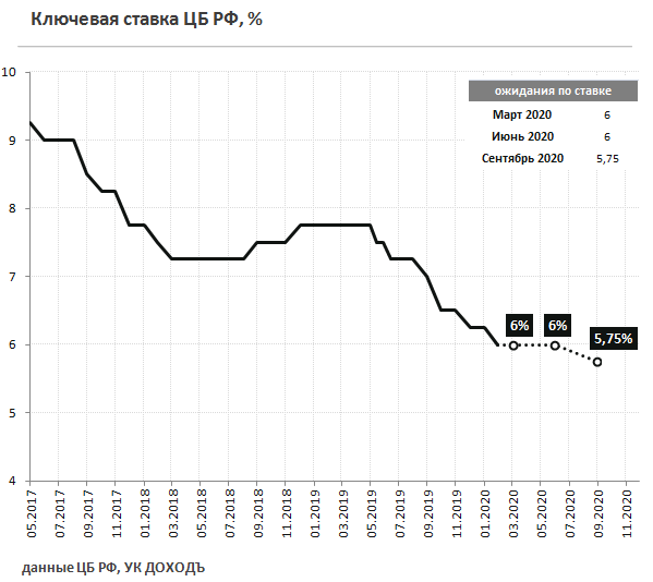 Принимая во внимание возможное долгосрочное дефляционное давление со стороны снижения спроса, снижения импорта, снижения цен на мировом товарном рынке, замедление роста денежной массы, мы ожидаем, что Банк России примет решение сохранить ключевую процентную ставку на текущем уровне 6%.