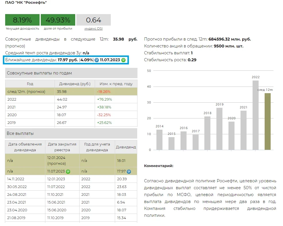 Напомним, что согласно дивидендной политике Роснефти, целевой уровень дивидендных выплат составляет не менее 50% от чистой прибыли по МСФО, целевой периодичностью является выплата дивидендов по меньшей мере два раза в год. Компания продолжает стабильно придерживаться дивидендной политике.