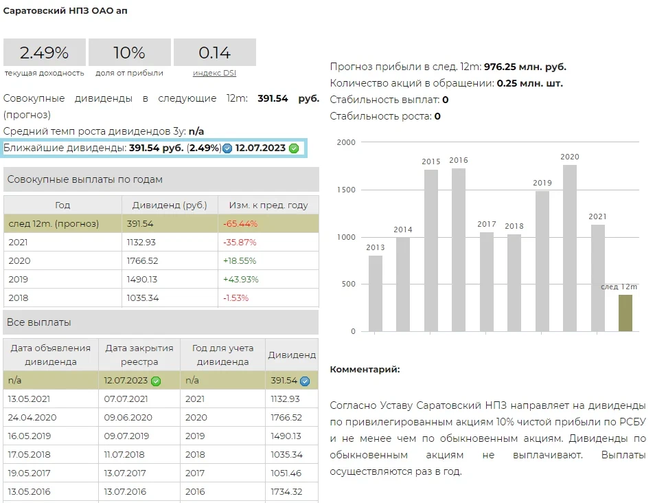 Согласно Уставу Саратовский НПЗ направляет на дивиденды по привилегированным акциям 10% чистой прибыли по РСБУ и не менее чем по обыкновенным акциям. Компания не раскрывает отчетность, если предположить, что дивидендная политика соблюдена, то размер чистой прибыли за 2022 год равен лишь 976,25 млн руб. Также существует вероятность сокращения дивидендной нормы.