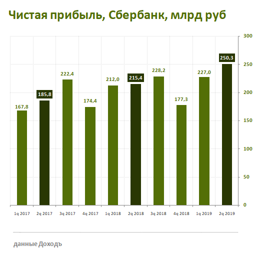 Крупнейший банк России Сбербанк показал умеренно-позитивные финансовые результаты по итогам 2 квартала 2019 года. Прибыль банка увеличилась на 16,3 % в годовом выражении до 250,3 млрд рублей, что стало рекордным показателем в истории. Чистые процентные доходы выросли всего на 1,2% до 353,1 млрд рублей. Улучшение прибыльности произошло в основном за счет статей, не относящихся к основным источникам дохода Сбербанка: доходов от операций по производным и непроизводным финансовым инструментам.