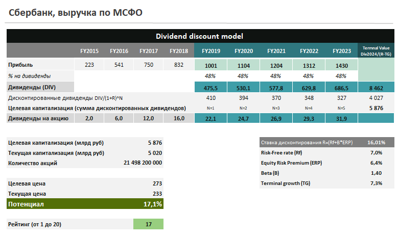 Компания планирует к 2020 году перейти к выплате 50% от прибыли по МСФО, при условии достаточности капитала выше уровня 12,5%. При достижении цели по прибыли в 1 трлн рублей, это сформирует дивиденд на уровне около 22 рублей на акцию. Текущая доходность обыкновенных акций в таком случае составит 9,4%, привилегированных – 10,9%. С учетом высокого индекса стабильности дивидендов, этого достаточно для попадания в портфель по дивидендной стратегии.