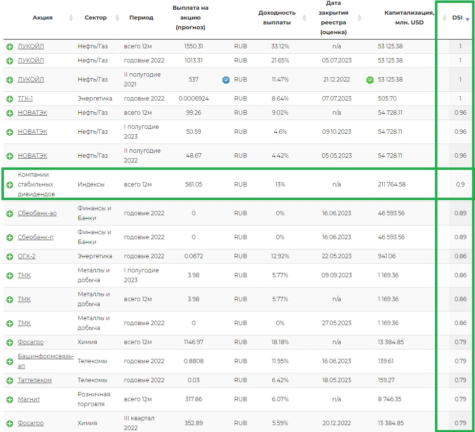 Индекс DSI в сервисе ДОХОДЪ Дивиденды