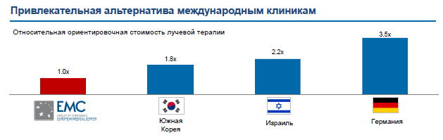 Согласно презентации компании, основным направлением для медицинского туризма является сегмент онкологии. Компания указывает, что стоимость лучевой терапии, например, в Германии в 3,5 раза выше.