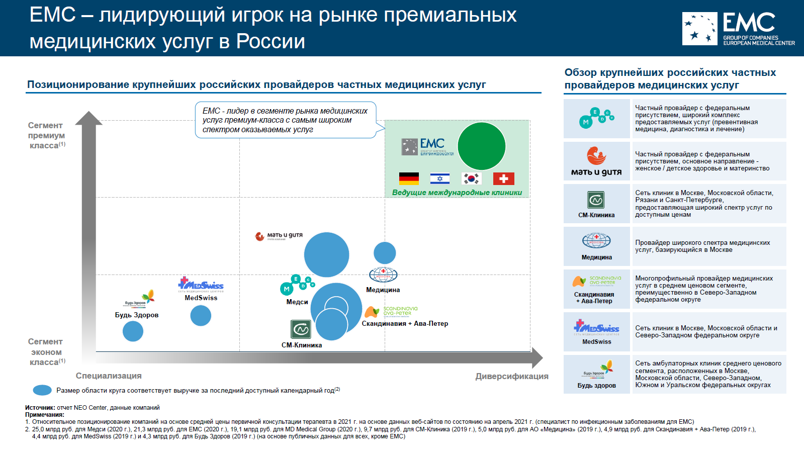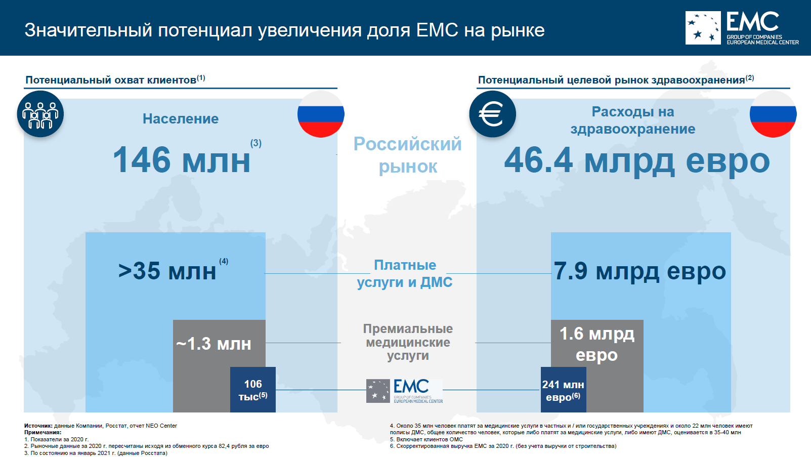 ЕМС считает, что текущее состояние российского здравоохранения, где наблюдается недостаточное финансирование из федерального бюджета, дефицит услуг как в стационарном, так и в амбулаторном сегментах, а также недостаточное количество услуг в сфере онкологии и недоосвоенность этого сегмента рынка, создает значительный потенциал для расширения и увеличения доли рынка для ЕМС.