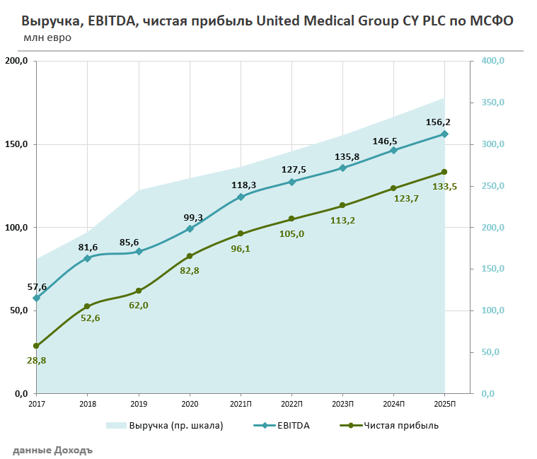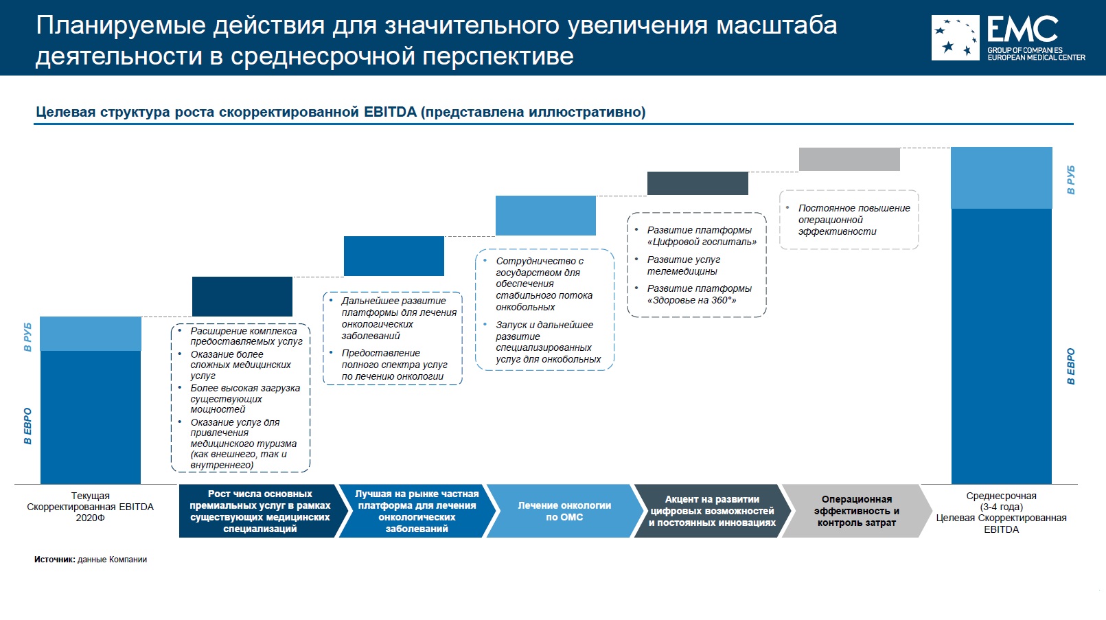 Предполагается, что рост EBITDA будет достигнут за счет расширения сегмента сложных медицинских услуг, усиления онкологического направления, развития цифровых платформ и телемедицины, более активного сотрудничества с государством и повышения операционной эффективности. Данные действия носят качественный, а не количественный характер развития и не потребуют крупных капитальных затрат.