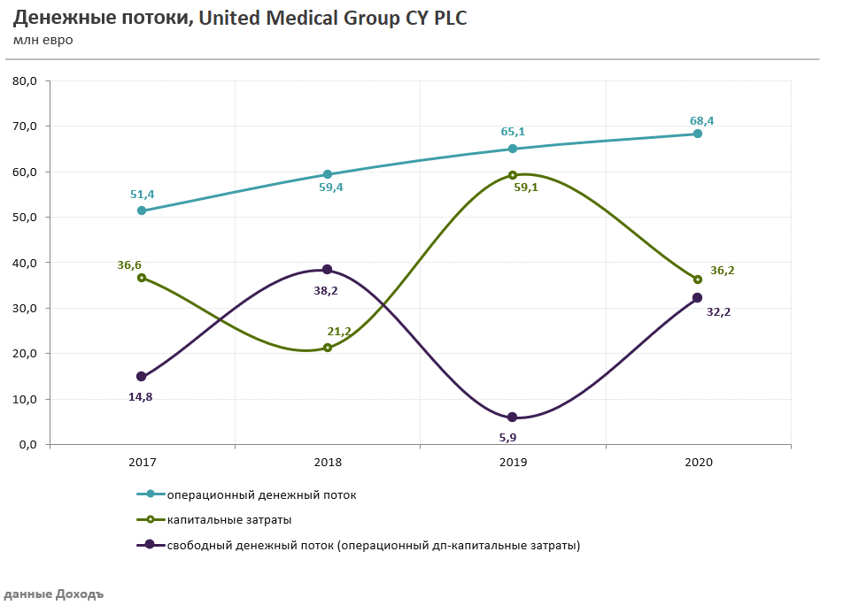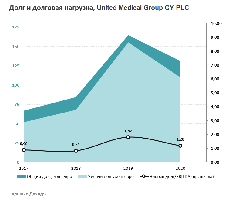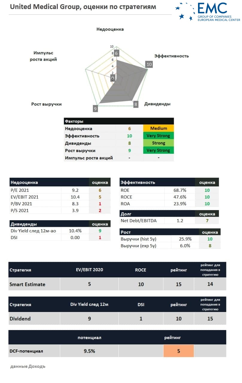 По новой дивидендной политики United Medical Group видит возможность ежегодно направлять до 100% чистой прибыли на выплату дивидендов, чему способствует устойчивая позиция компании на рынке и отсутствие планов по осуществлению новых крупных инвестиций. Планируемые дивидендные выплаты в 2021 году обозначены на уровне 114 млн евро - 76 млн евро за отчетный 2020 год и 38 млн евро за 1 полугодие 2021 года.