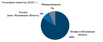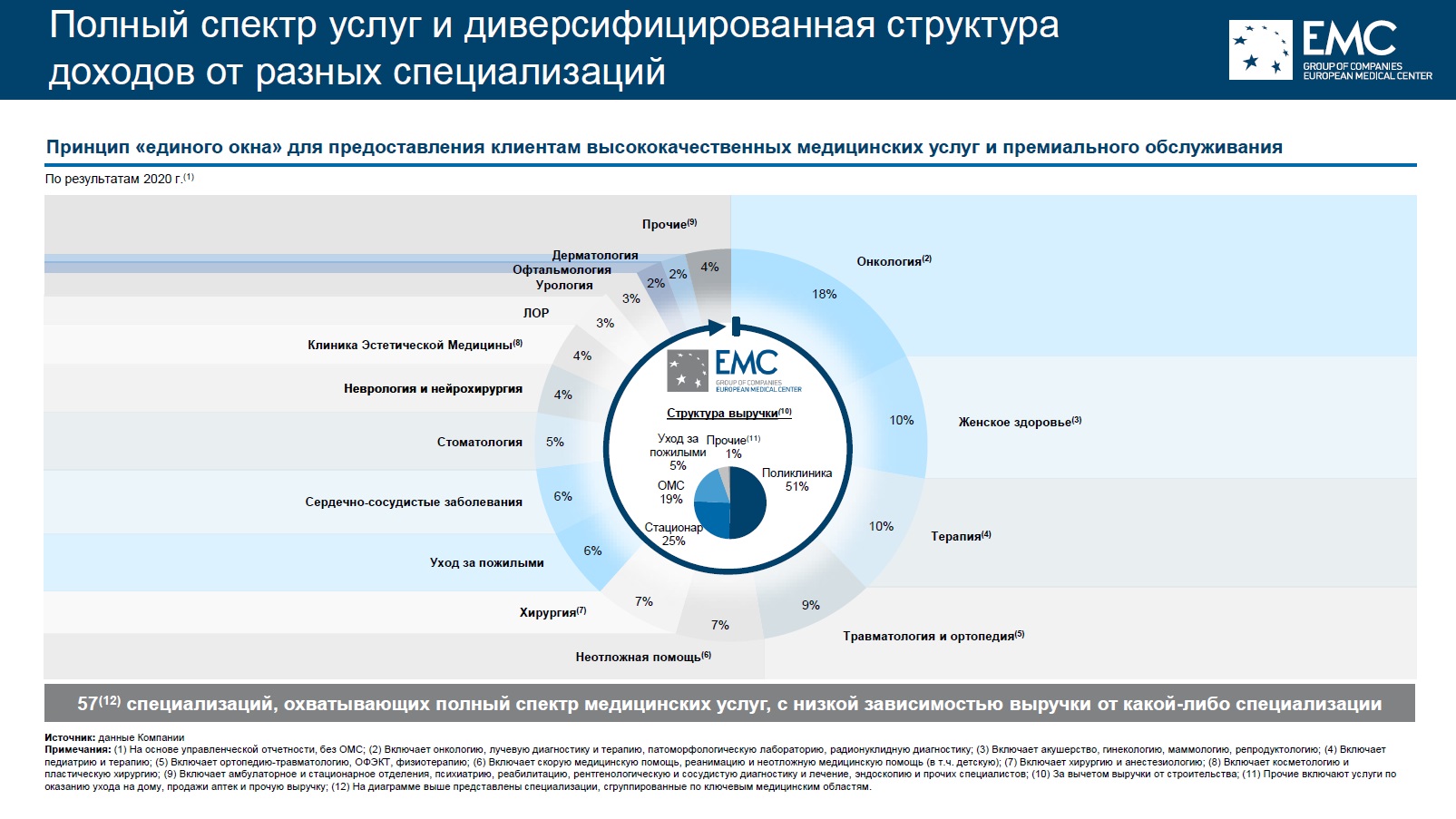 ЕМС охватывает полный спектр медицинских услуг. Основные направления – онкология, женское здоровье и терапия. ЕМС – это ультра премиальный сегмент, основными клиентами являются жители Москвы и Московской области с высокими доходами (по итогам 2020 года доля Московской агломерации составляла 84% от всех клиентов).