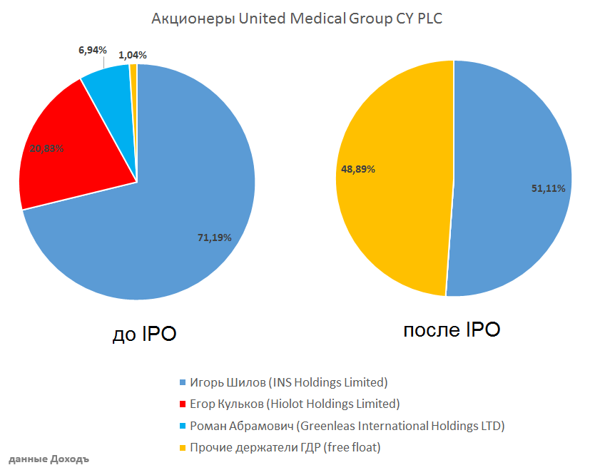 Основными бенефициарами United Medical Group на момент IPO являлись Игорь Шилов (71,19%), а также бывший партнер Виктора Харитонина по «Фармстандарту» Егор Кульков и миллиардер Роман Абрамович (20,83% и 6,94% соответственно).