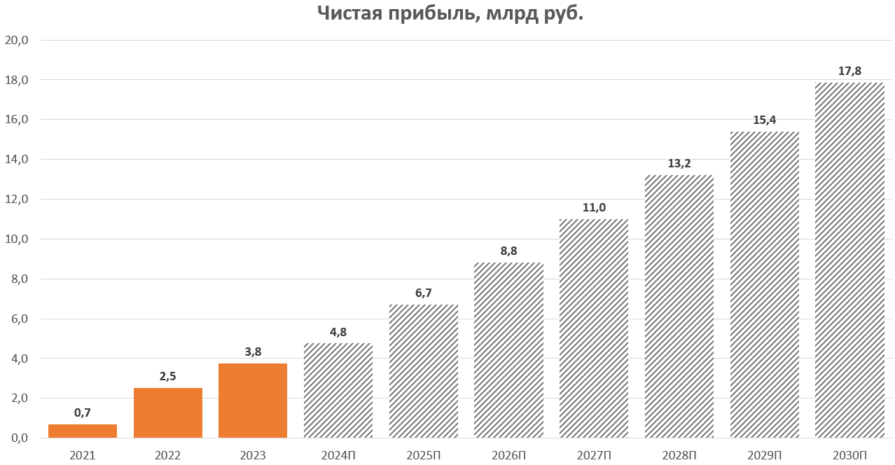 Благодаря увеличению количества заказов, открытию новых ПВЗ и расширению ассортимента, по результатам 2023 г. чистая прибыль компании составила 3.8 млрд руб. (+49%). Ожидаем, что чистая прибыль по итогам 2024 г. составит 4.8 млрд руб. (26.5%) и продолжит расти в среднем на 25% ежегодно до 2030 года.