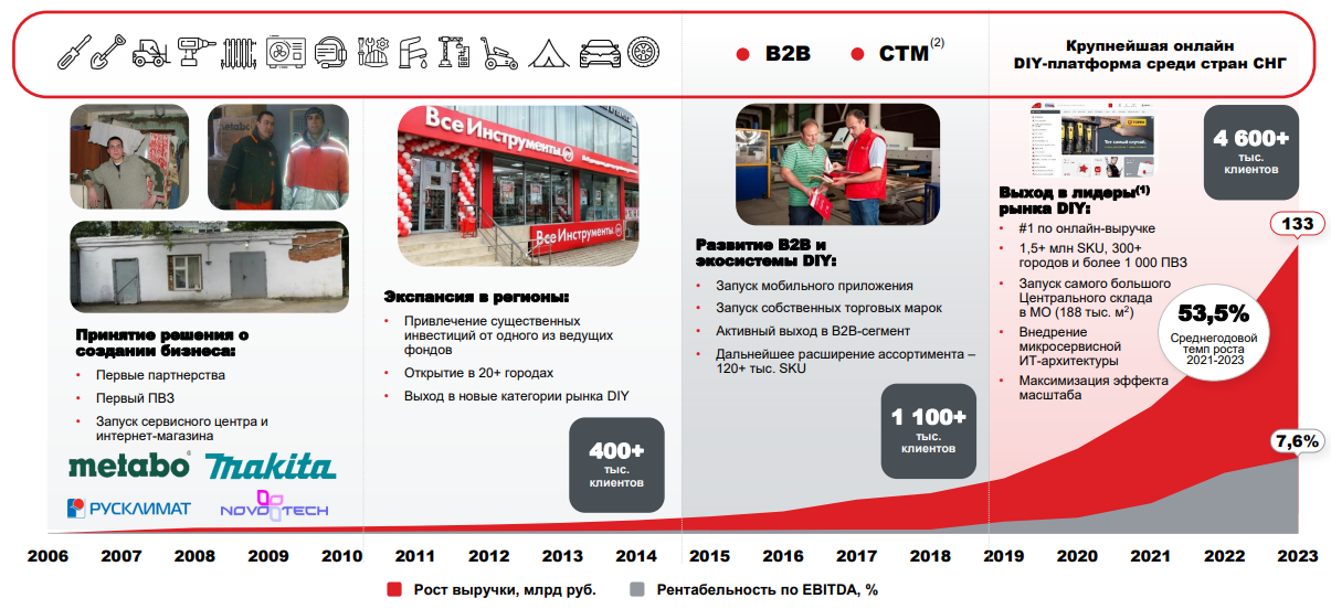 История компании началась еще в 2006 году с маленького стартапа, первых партнерств и доставки заказов. К 2010 году компания открыла свой первый ПВЗ. В 2011 году у компании уже была собственная сеть магазинов и ПВЗ в более чем 20 городах, а также создана операционная компания ООО «ВсеИнструменты.ру», которая сфокусировалась на выходе в новые категории DIY-рынка и дальнейшем развитии.